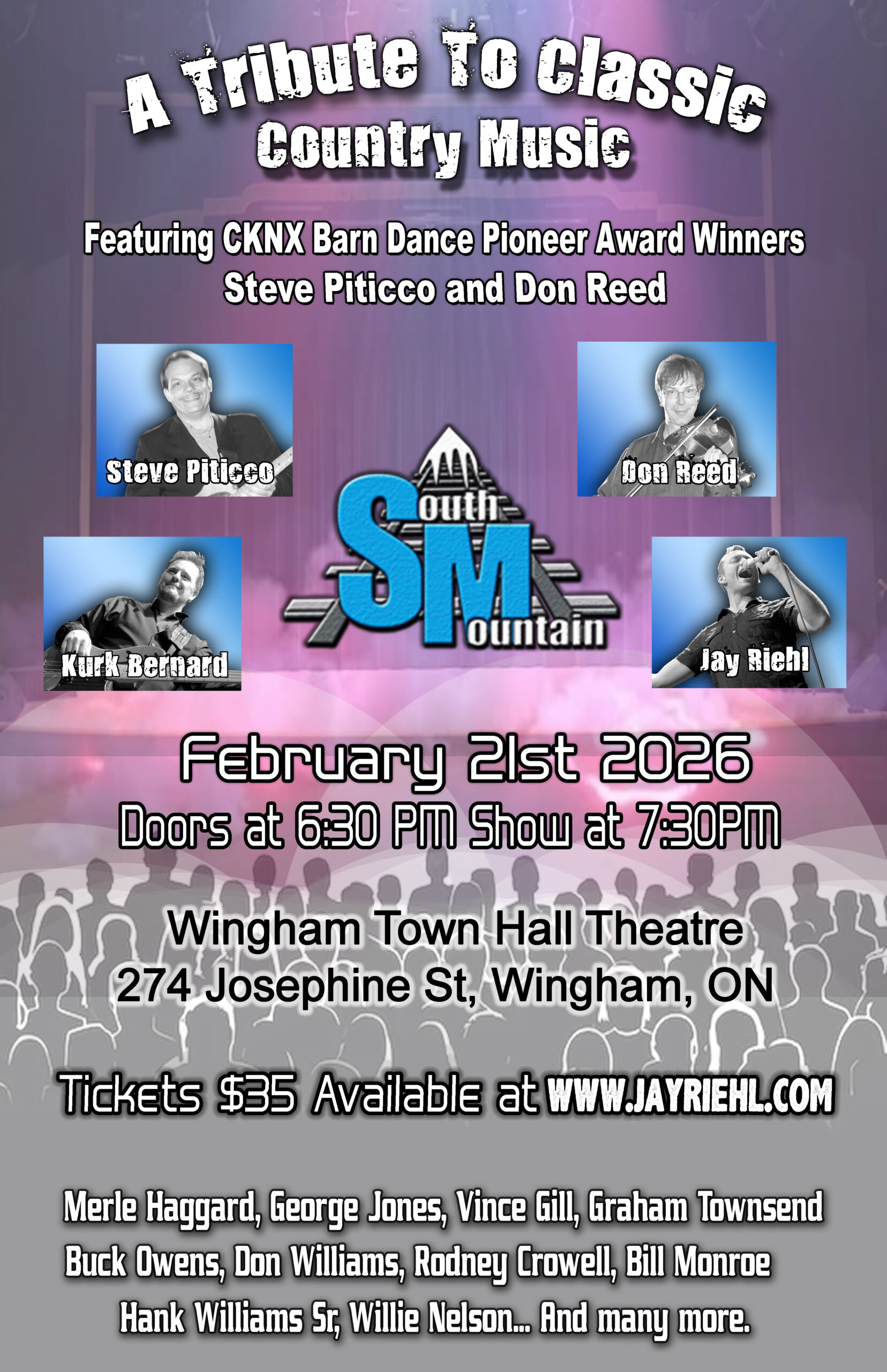Wingham Town Hall Theatre 274 Josephine Street, Wingham, Ontario, CanadaA Tribute to Classic Country Music Featuring CKNX Barn Dance Pioneer Award Winners Steve Piticco and Don Reed. Doors open at 6:30. Show start at 7:30 PM Tickets $35 available …
